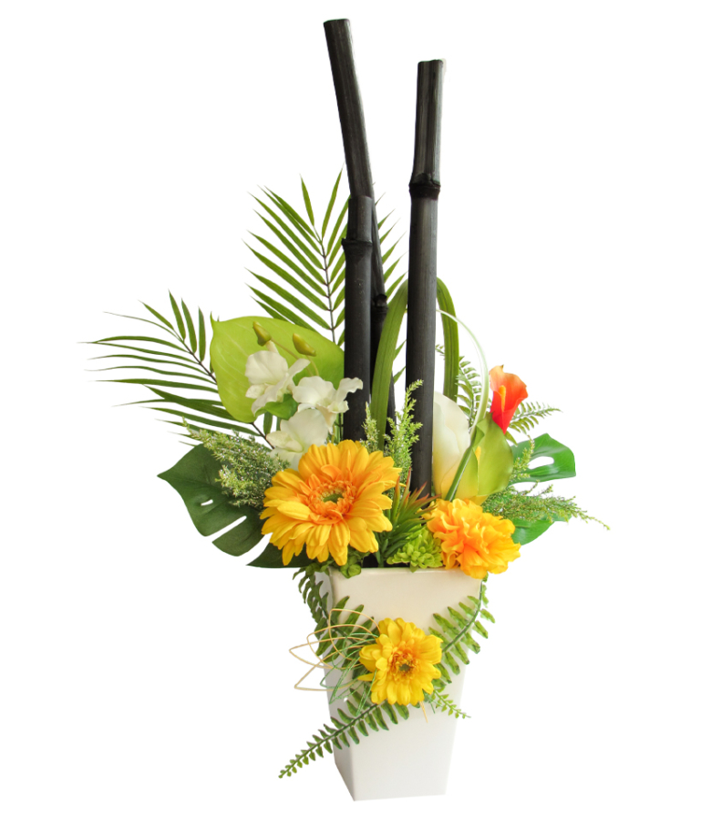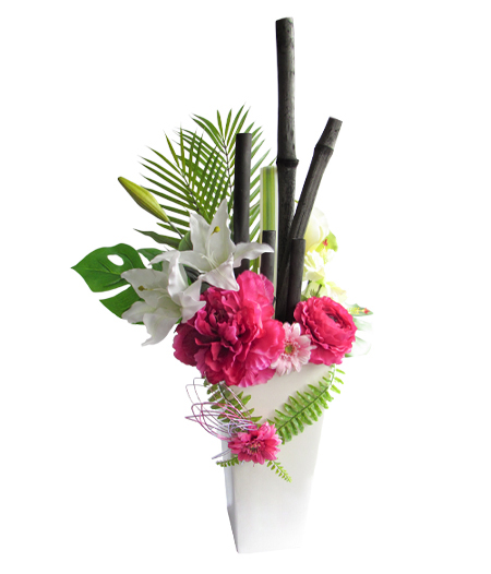 祝い竹炭は、漆黒の竹炭と色彩豊かな花々をアートへの昇華させた、美しいインテリアです。