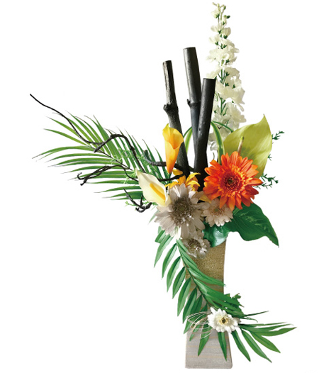 「希望」や「親しみやすい」などの花言葉を持つガーベラと竹炭で艶やかに存在感を放つ祝い竹炭です。葉の緑色も相まって一つの絵画のようです。小さめの水引はお花と竹炭の邪魔をせずに控えています。一直線に立つ花瓶は繁栄の未来へ手を伸ばそうとしているかのようです。