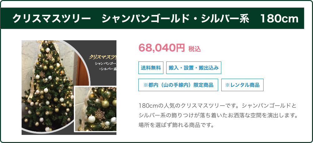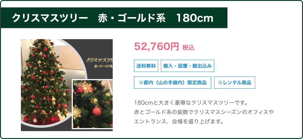 飾りつけや設置、撤去作業など料金に含まれているクリスマスツリーのレンタル商品です。毎年の設置や保管場所に困らないクリスマスシーズンだけ飾っておける手間がかからない商品です。